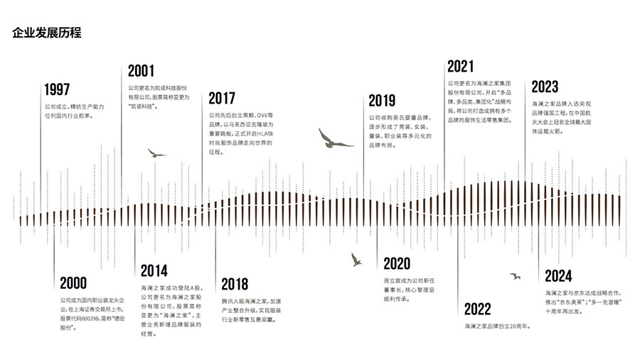 海瀾之家集團(tuán)股份有限公司的前身為凱諾科技股份有限公司,成立于1997年,2000年在上海證券交易所掛牌上市,股票代碼600398。海瀾之家總部位于江蘇省江陰市新橋鎮(zhèn),是國內(nèi)服裝行業(yè)龍頭企業(yè)、全國文明單位。以“海瀾”為企業(yè)命名,寓意為“以海闊天空之博大,創(chuàng)波瀾壯美之事業(yè)”。“不斷否定自己,永遠(yuǎn)追求卓越”是海瀾的企業(yè)精神,創(chuàng)新是海瀾的企業(yè)靈魂。