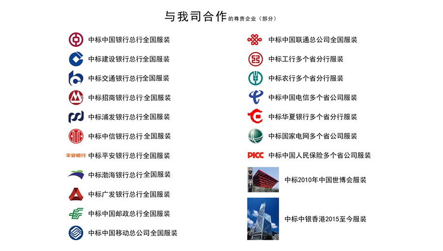 團(tuán)購服務(wù)網(wǎng)絡(luò)已覆蓋全國各省、市、縣(區(qū))及鄉(xiāng)鎮(zhèn)各級(jí)地域,分公司遍及全國,有5000余家門店,10000余名服務(wù)人員,300余名量體師為制裝客戶提供全面的售后服務(wù)。持續(xù)為國內(nèi)四大國有商業(yè)銀行及交通銀行、浦發(fā)銀行、招商銀行、中信銀行、廣發(fā)銀行等一系列大型企業(yè)設(shè)計(jì)行業(yè)制服??蛻羧荷婕敖鹑凇⒈kU(xiǎn)、電力、法院、檢察院、稅務(wù)、工商、水政、技術(shù)監(jiān)督、電信、移動(dòng)、聯(lián)通、郵政、公路、航空機(jī)場(chǎng)、地鐵、保險(xiǎn)、券商、上市公司、環(huán)保、煙草、學(xué)校、醫(yī)院等20萬余家政府、企事業(yè)單位。更為國慶、世博會(huì)、奧運(yùn)會(huì)、達(dá)沃斯論壇一系列大型盛會(huì)制作正裝。