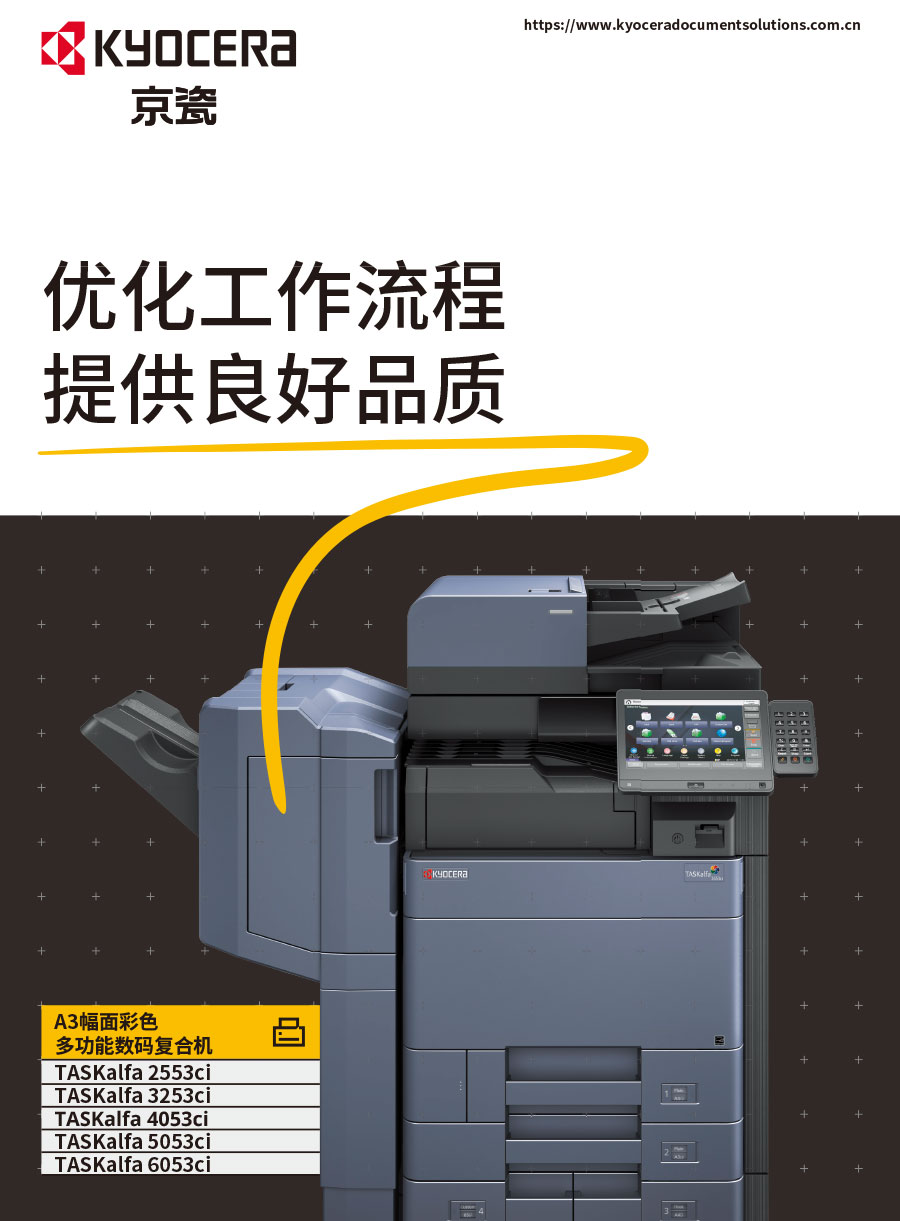 京瓷株式會社由稻盛和夫先生創(chuàng)辦于1959年。“敬天愛人”社訓貫徹集團各分公司運營中。京瓷辦公信息系統(tǒng)(中國)有限公司主要負責彩色和黑白數碼復合機、彩色和黑白數碼激光打印機、生產型彩色噴墨數碼印刷系統(tǒng)、辦公解決方案等系列辦公自動化設備的銷售。京瓷產品憑借其更低的后期總體使用成本,可靠的長壽命感光鼓,獲得眾多政府、企業(yè)的青睞,在中國的市場占有率逐年穩(wěn)步提升。