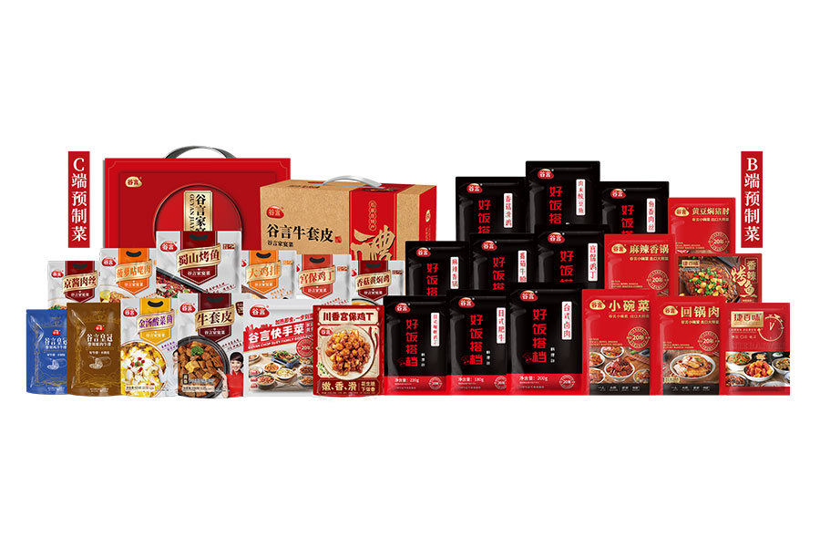 主要產(chǎn)品:谷言預(yù)制菜、捷百味料理包、谷言牧場(chǎng)高端牛肉、嗨飯師自熱產(chǎn)品、速食等
