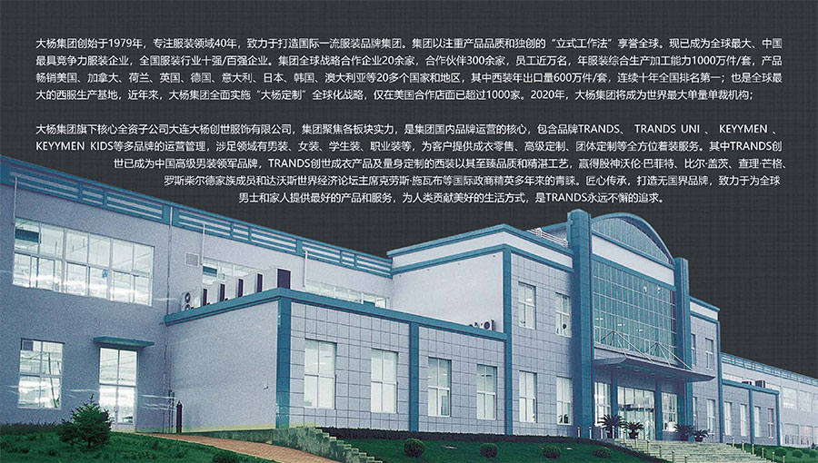 大楊集團(tuán)創(chuàng)建于1979年,總部位于遼寧省大連市,主要生產(chǎn)和銷售各類中高檔服裝產(chǎn)品為主的國際化大型服裝企業(yè),以西裝縫制享譽全球,是世界重要的西裝生產(chǎn)加工基地?,F(xiàn)有直屬(控股)成員企業(yè)20家,員工4500人??毓勺庸敬筮B大楊創(chuàng)世股份有限公司2000年在上海證券交易所上市,并于2016年完成重大資產(chǎn)重組。