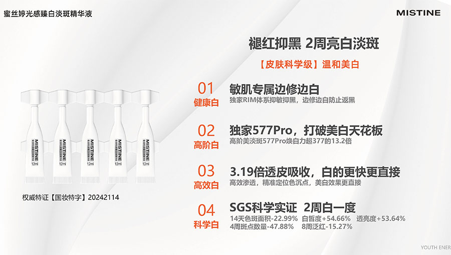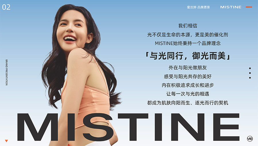 MISTINE蜜絲婷堅持圍繞對“光”的研究,在光與防曬護膚、光與色彩妝容的產(chǎn)品應(yīng)用層面,研究光、理解光、樂享光,持續(xù)不斷地提供產(chǎn)品解決方案,滿足消費者對防曬美白、潮流妝容、護膚健康的需求。