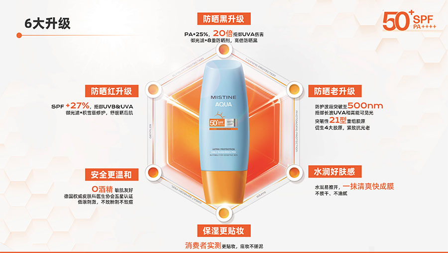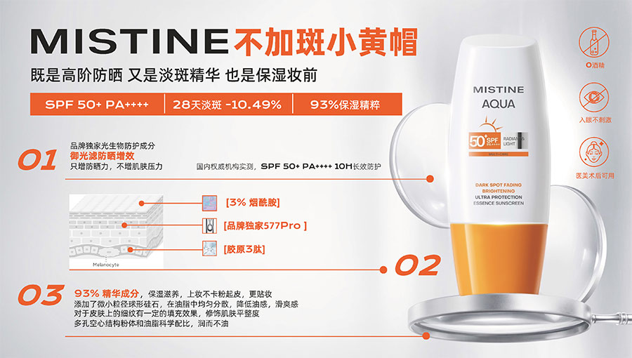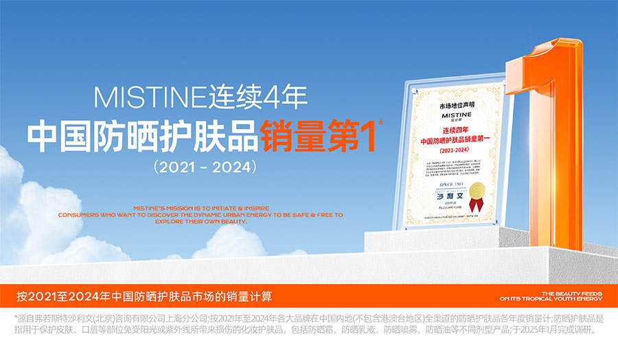 歷經(jīng)37年的科研沉淀,MISTINE蜜絲婷品牌在防曬、護膚、底妝、彩妝多個品類的產(chǎn)品開發(fā)中,堅持圍繞對“光”的研究,在光與防曬護膚、光與色彩妝容的產(chǎn)品應(yīng)用層面,研究光、理解光、樂享光,持續(xù)不斷地提供產(chǎn)品解決方案,滿足消費者對防曬美白、潮流妝容、護膚健康的需求。防曬系列產(chǎn)品作為MISTINE蜜絲婷的知名品類,以物化生一體的全鏈路防曬技術(shù),憑借高倍防曬、清爽膚感的高功效和高質(zhì)價比勝出,自2021年連續(xù)三年位于中國防曬護膚品銷量領(lǐng)先。