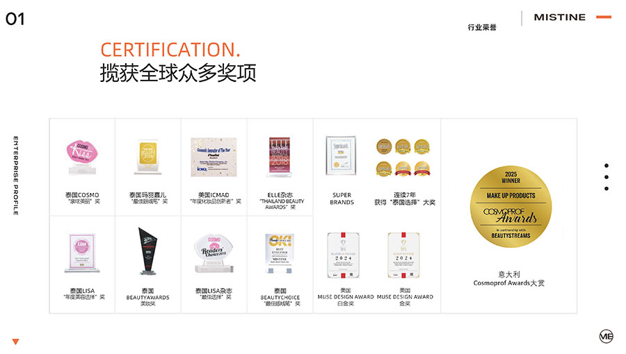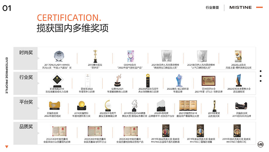 37年來,MISTINE蜜絲婷步履不停,堅持從消費者出發(fā),以優(yōu)質(zhì)專研產(chǎn)品、適時而動的渠道策略和持續(xù)發(fā)力的品牌塑造,贏得眾多消費者的喜愛和行業(yè)內(nèi)外的贊許。迄今,MISTINE蜜絲婷已連續(xù)七年攬獲“泰國選擇”大獎,同時先后榮獲中國化妝品大會藍玫獎「年度競爭力品牌」、IQF國際品質(zhì)節(jié)暨消費領(lǐng)導(dǎo)力峰會「杰出消費影響力品牌」、CAQI中國質(zhì)量網(wǎng)「全國美妝行業(yè)質(zhì)量領(lǐng)先品牌」、天貓金妝獎超級單品「年度防曬獎」、凱度消費者指數(shù)「極具成長力品牌」等榮譽。
