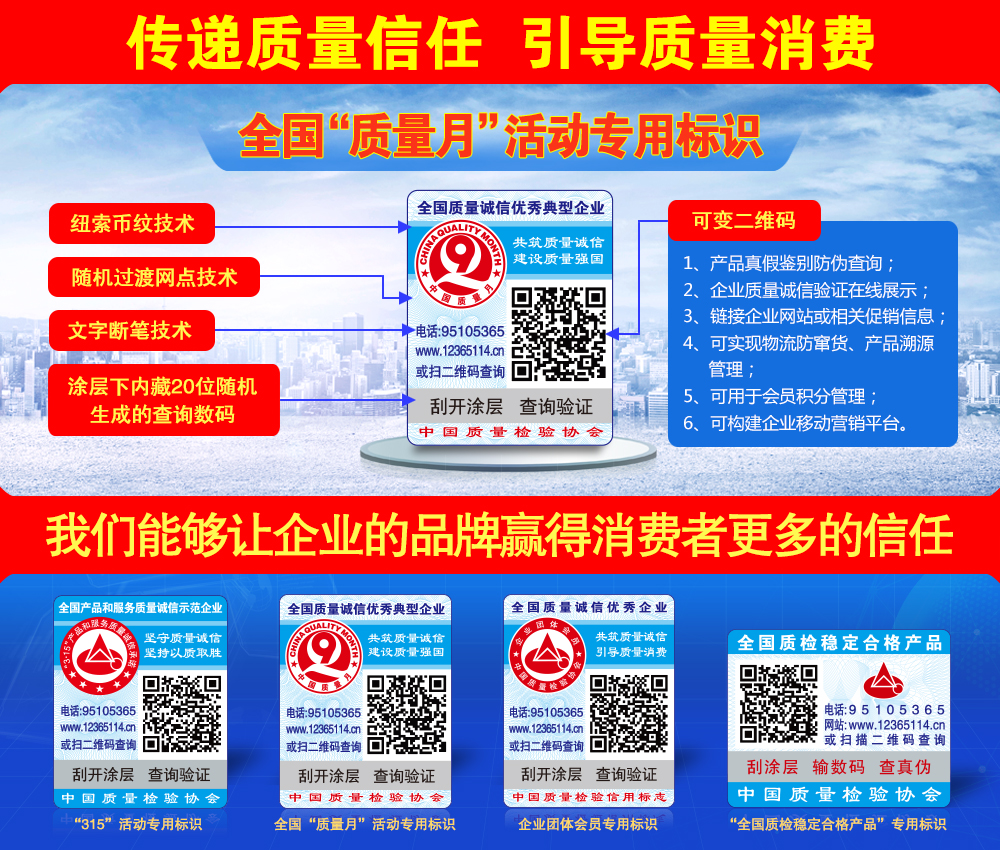 中國質(zhì)量檢驗協(xié)會防偽溯源和物流管理服務系統(tǒng)(簡稱中檢聯(lián)合質(zhì)量誠信驗證系統(tǒng))是以物聯(lián)網(wǎng)、大數(shù)據(jù)、云計算、區(qū)塊鏈和移動互聯(lián)網(wǎng)技術(shù)為基礎建設的全過程防偽溯源與質(zhì)量誠信驗證服務平臺,依托廣大技術(shù)機構(gòu)的技術(shù)支撐,應用二維碼為載體,使用一物一碼防偽技術(shù),同時采用文字、圖片和視頻等多媒體方式,完整記錄產(chǎn)品的原料來源、生產(chǎn)加工、倉儲物流和市場銷售等詳細信息,融合實現(xiàn)產(chǎn)品質(zhì)量來源可查、去向可追、責任可究的全過程追溯,切實方便企業(yè)履行質(zhì)量安全主體責任并用科技、智能化、信息化的手段去加強質(zhì)量安全風險控制,維護消費者合法權(quán)益,讓人民群眾買得放心、吃得放心、用得放心...