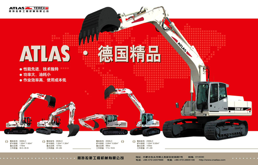 中國(guó)阿特拉斯是高新技術(shù)企業(yè),主要生產(chǎn)和銷售具有世界先進(jìn)水平的ATLAS 20噸級(jí)以上中大型及礦用挖掘機(jī)。該系列挖掘機(jī)具有“性能先進(jìn)、技術(shù)獨(dú)特;功率大、油耗??;作業(yè)效率高、使用成本低”的突出特點(diǎn),可廣泛應(yīng)用于礦山開采及城鄉(xiāng)建設(shè)。