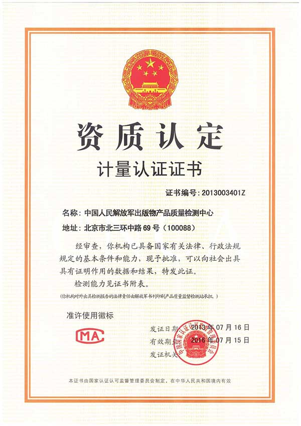 中國人民解放軍出版物產(chǎn)品質(zhì)量檢測中心(以下簡稱“檢測中心”)成立于2012年,2013年7月經(jīng)國家認證認可監(jiān)督委員會審核批準(zhǔn)授予中國計量認證CMA認可資質(zhì)。2014年9月通過國家認證認可監(jiān)督委員會計量認證擴項評審,批準(zhǔn)檢測能力三十余項。是全軍首家擁有國家級資質(zhì)的出版物產(chǎn)品質(zhì)量檢測鑒定機構(gòu),具有獨立為軍隊和社會提供公正、準(zhǔn)確的檢測數(shù)據(jù)及有法律效力的檢測報告的能力。