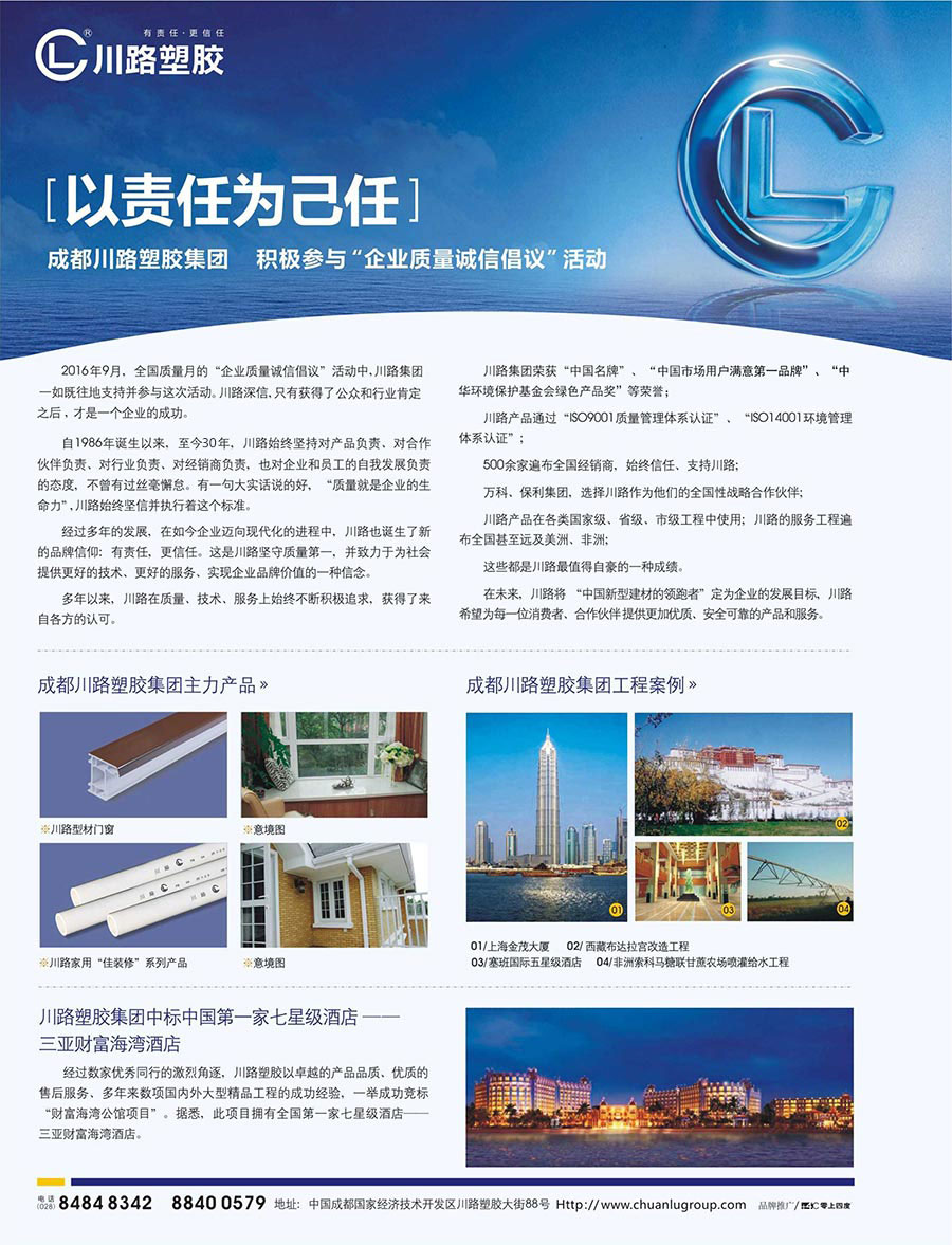 成都川路塑膠集團(tuán)創(chuàng)建于1986年,是一家專業(yè)生產(chǎn)新型化學(xué)建材的中外合資企業(yè),總部位于中國(guó)·成都國(guó)家經(jīng)濟(jì)技術(shù)開發(fā)區(qū),是目前國(guó)內(nèi)同行業(yè)中成立早、規(guī)模大、品種齊、質(zhì)量?jī)?yōu)、開發(fā)能力強(qiáng),品牌價(jià)值、企業(yè)固定資產(chǎn)超過(guò)十億元的名牌企業(yè)。