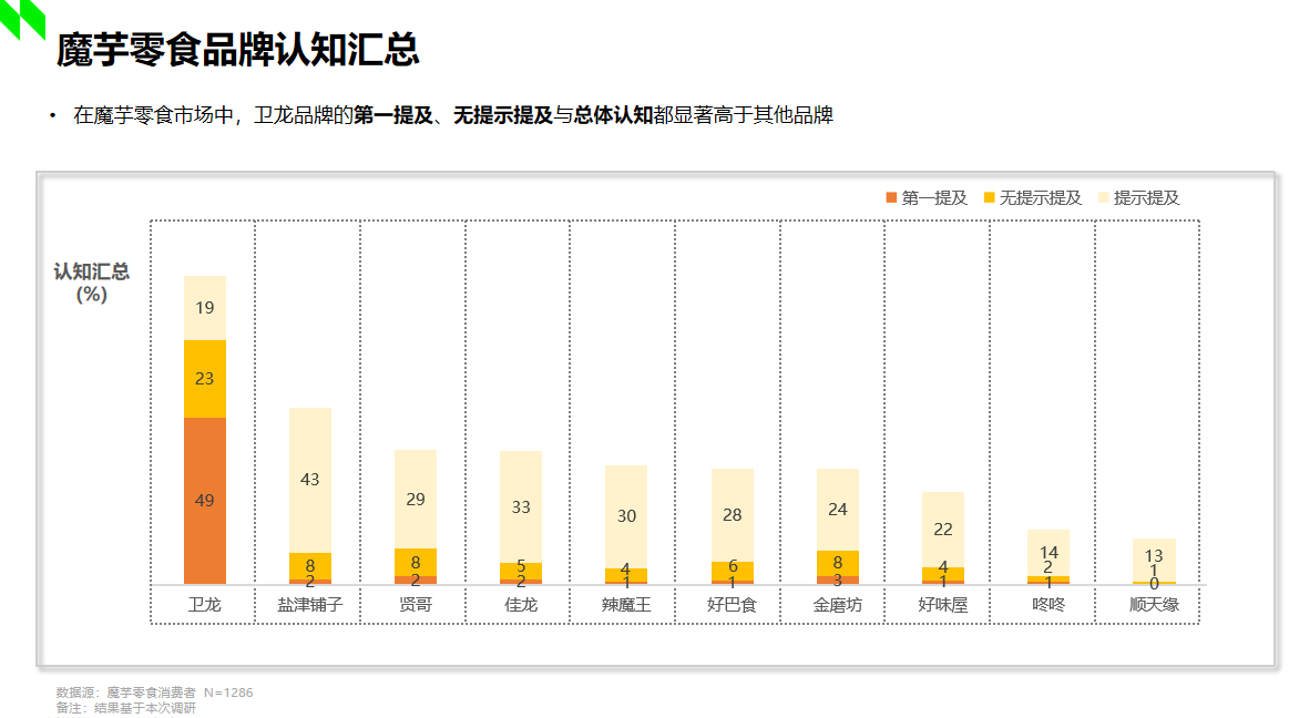 據(jù)2022年尼爾森調(diào)研顯示,在魔芋市場(chǎng)中,衛(wèi)龍品牌的第一提及、無(wú)提示提及與總體認(rèn)知都顯著高于其他品牌。顯然,衛(wèi)龍發(fā)明的魔芋爽在市場(chǎng)中已然奠定了良好且堅(jiān)固的受眾認(rèn)知基礎(chǔ),那么“小魔女”的加入,不僅進(jìn)一步充實(shí)了衛(wèi)龍自身的產(chǎn)品矩陣,占位了“魔芋素毛肚”的產(chǎn)品類(lèi)目,也將引領(lǐng)魔芋休閑食品賽道邁向更高品質(zhì)的發(fā)展方向,為市場(chǎng)打開(kāi)全新的增量機(jī)遇。