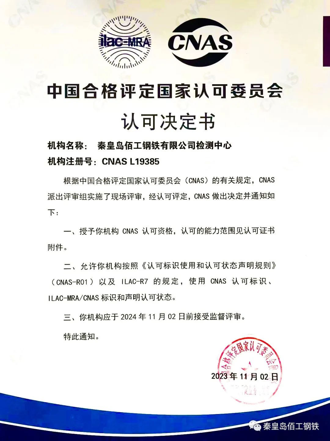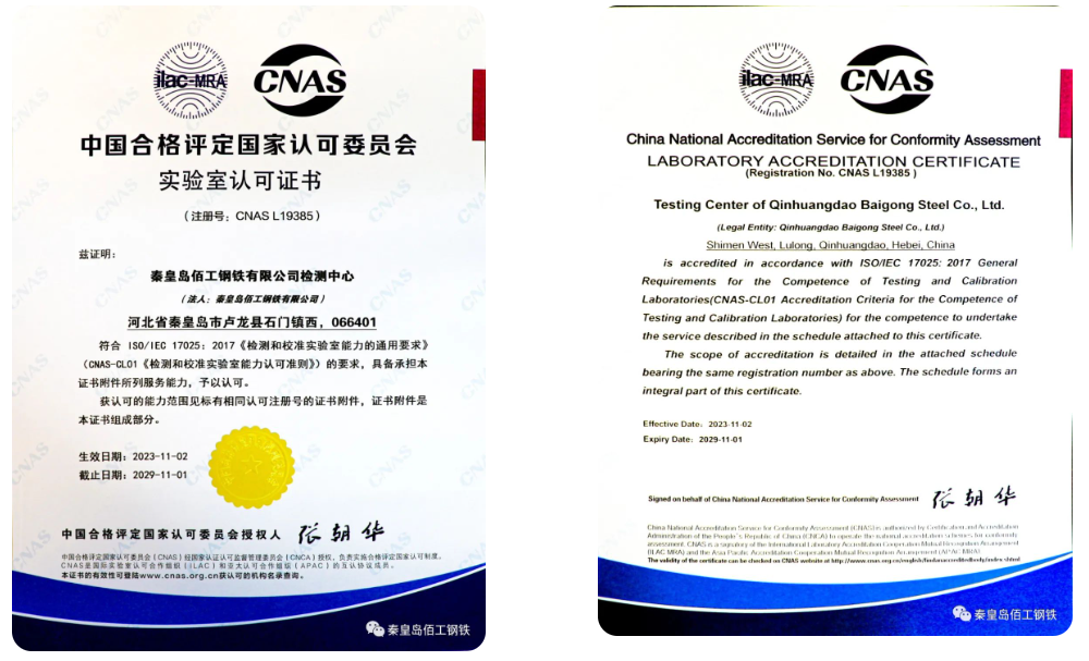 秦皇島佰工鋼鐵有限公司榮獲國(guó)家CNAS實(shí)驗(yàn)室認(rèn)可