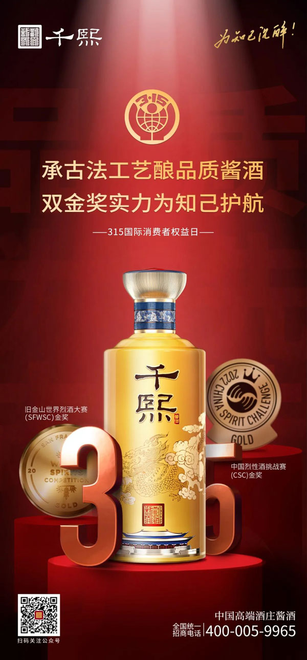 每一年的315消費(fèi)者權(quán)益日,大眾對(duì)食品安全,消費(fèi)安全總是格外敏感。作為一家以“抱樸守真 一諾千年”為品質(zhì)理念的醬酒企業(yè),從“舊金山世界烈酒大賽金獎(jiǎng)”到榮獲“CSC 中國(guó)烈性酒挑戰(zhàn)賽金獎(jiǎng)”等稱號(hào),千熙酒業(yè)始終不忘初心,以消費(fèi)者至上為宗旨,以品牌為責(zé)任,為消費(fèi)者打造品質(zhì)以恒持的一杯好酒。