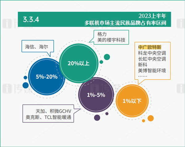 作為中央空調市場的絕對權重品類,多聯機一直以來都能以一己之力決定行業(yè)的風向,而2023上半年,多聯機市場的走勢與行業(yè)大勢卻呈現相悖的局面,下滑4.2%。其下滑走勢的原因與房產經濟走勢緊密相關。在品牌陣營上,國產陣營、歐美陣營以及日韓陣營組成了中國中央空調行業(yè)的三大陣容,且愈發(fā)穩(wěn)固。其中,國產陣營穩(wěn)穩(wěn)占據著超過一半的市場份額,擁有后發(fā)優(yōu)勢的中廣歐特斯通過兩年時間的沖刺,已在其中占有一席之地。