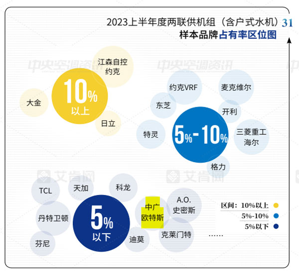 經過多年的發(fā)展,中國中央空調市場的品牌格局基本穩(wěn)定。結合2023上半年各品牌的市場表現,該報告將品牌出貨規(guī)模區(qū)位分為5大陣營,其中,中廣歐特斯在10億元以下規(guī)模榜上有名。