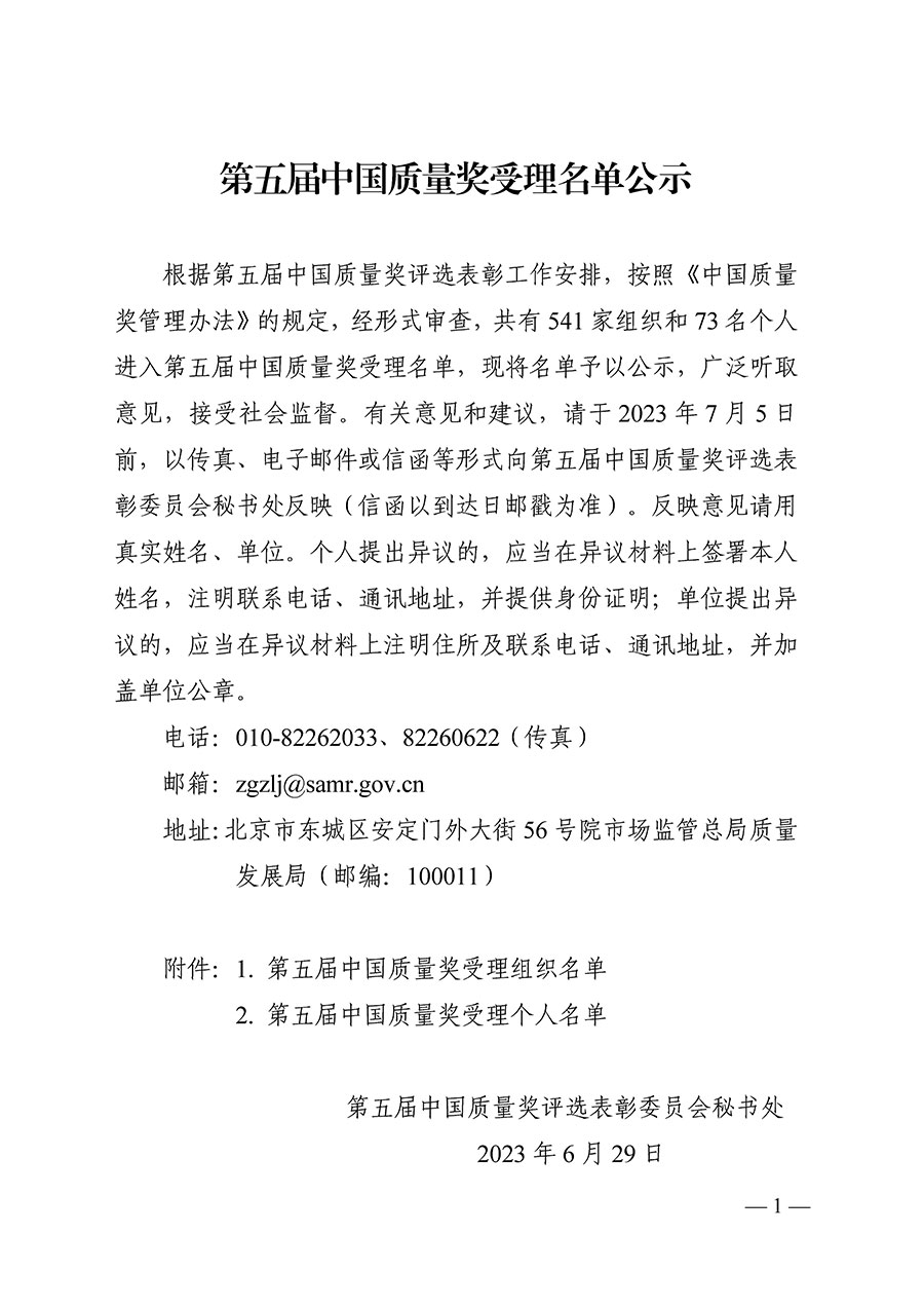 據(jù)悉,有關(guān)意見(jiàn)和建議可于 2023 年 7 月 5 日前,以傳真、電子郵件或信函等形式向第五屆中國(guó)質(zhì)量獎(jiǎng)評(píng)選表彰委員會(huì)秘書處反映(信函以到達(dá)日郵戳為準(zhǔn))。反映意見(jiàn)應(yīng)當(dāng)用真實(shí)姓名、單位。個(gè)人提出異議的,應(yīng)當(dāng)在異議材料上簽署本人姓名,注明聯(lián)系電話、通訊地址,并提供身份證明;單位提出異 議的,應(yīng)當(dāng)在異議材料上注明住所及聯(lián)系電話、通訊地址,并加蓋單位公章。