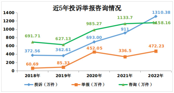 2022年,全國(guó)市場(chǎng)監(jiān)管部門通過全國(guó)12315平臺(tái)、電話、傳真、窗口等渠道共受理消費(fèi)者投訴、舉報(bào)和咨詢2940.77萬(wàn)件,同比增長(zhǎng)23.5%。其中,投訴1310.38萬(wàn)件,舉報(bào)472.23萬(wàn)件,為消費(fèi)者挽回經(jīng)濟(jì)損失45.19億元,有力保護(hù)了消費(fèi)者合法權(quán)益。主要呈現(xiàn)十大特點(diǎn):
