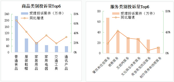 2022年,全國(guó)市場(chǎng)監(jiān)管部門共受理商品投訴862.32萬(wàn)件,占投訴的65.81%,較上年提高4.37個(gè)百分點(diǎn);服務(wù)投訴448.06萬(wàn)件,占投訴的34.19%。商品類投訴占比提升,反映了實(shí)體經(jīng)濟(jì)下行壓力下產(chǎn)品質(zhì)量問題凸顯,其中投訴量靠前的是:普通食品、服裝鞋帽、家居用品、家用電器、交通工具、通訊產(chǎn)品,占比58.43%。服務(wù)投訴量靠前的是:餐飲住宿、銷售、互聯(lián)網(wǎng)服務(wù)、文化娛樂體育、美容美發(fā)洗浴,占比46.37%。