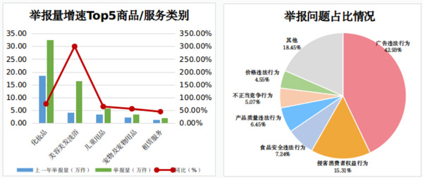 消費(fèi)者積極發(fā)揮社會(huì)監(jiān)督作用,2022年全年向市場(chǎng)監(jiān)管部門舉報(bào)各類違法線索472.23萬(wàn)件,同比增長(zhǎng)40.34%,其中舉報(bào)廣告違法行為202.73萬(wàn)件、侵害消費(fèi)者權(quán)益行為72.31萬(wàn)件、食品安全違法行為34.18萬(wàn)件。從增幅看,不正當(dāng)競(jìng)爭(zhēng)行為、商標(biāo)違法行為、網(wǎng)絡(luò)交易違法行為舉報(bào)同比上升均超過60%。