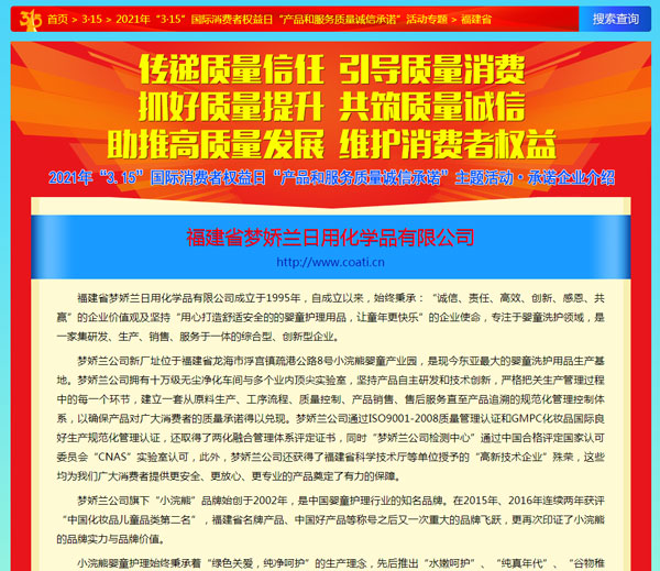 引導質量消費,共筑質量誠信,3月15日,由中國質量檢驗協(xié)會主辦的2021年“3.15”產(chǎn)品和服務質量誠信承諾的主題活動如期舉行,小浣熊作為“3.15”產(chǎn)品和服務質量誠信承諾企業(yè),憑借匠心的品質、優(yōu)質的服務及良好的口碑,獲得協(xié)會以及權威專家的一致認可,榮獲“全國產(chǎn)品和服務質量誠信示范企業(yè)”,“全國質量誠信先進企業(yè)”、“全國質量信譽保障產(chǎn)品”、“全國日化行業(yè)質量領先品牌” 等多項榮譽,《中國質量報》、《中國消費者報》及中國質量網(wǎng)、中國經(jīng)濟網(wǎng)、中國消費網(wǎng)等多家媒體均予以集中展示和公告。