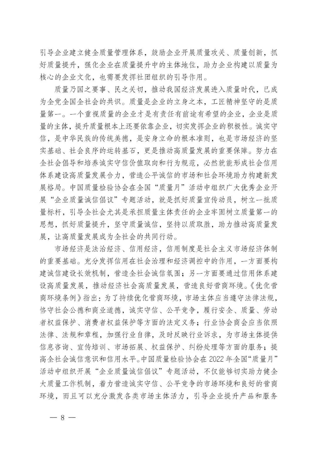 李克強(qiáng)總理批示指出,打造集質(zhì)量、標(biāo)準(zhǔn)、技術(shù)、品牌等于一體的高品質(zhì)產(chǎn)品和服務(wù),在市場(chǎng)競(jìng)爭(zhēng)中鍛就中國(guó)質(zhì)量、培育中國(guó)精品。倡導(dǎo)企業(yè)對(duì)產(chǎn)品和服務(wù)質(zhì)量作出誠(chéng)信倡議,也是中國(guó)質(zhì)量檢驗(yàn)協(xié)會(huì)自2004年以來組織開展全國(guó)“質(zhì)量月”企業(yè)質(zhì)量誠(chéng)信倡議專題活動(dòng)的要義。謹(jǐn)期社會(huì)各界共同努力,推進(jìn)質(zhì)量社會(huì)共治,抓好產(chǎn)品和服務(wù)的高品質(zhì)質(zhì)量提升,共同為我們的質(zhì)量強(qiáng)國(guó)事業(yè)去奮斗!