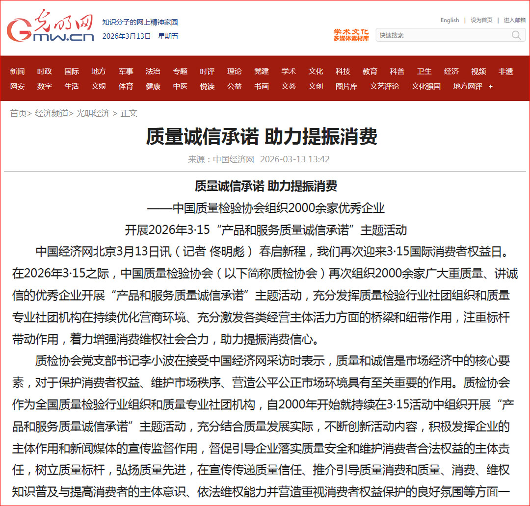 光明網(wǎng)報道:質(zhì)量誠信承諾 助力提振消費——中國質(zhì)量檢驗協(xié)會組織2000余家優(yōu)秀企業(yè)開展2026年3·15“產(chǎn)品和服務(wù)質(zhì)量誠信承諾”主題活動