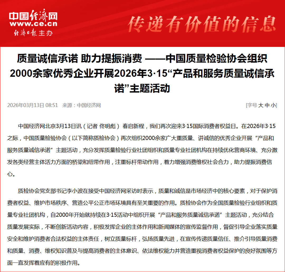中國經(jīng)濟(jì)網(wǎng)發(fā)布:質(zhì)量誠信承諾 助力提振消費——中國質(zhì)量檢驗協(xié)會組織2000余家優(yōu)秀企業(yè)開展2026年3·15“產(chǎn)品和服務(wù)質(zhì)量誠信承諾”主題活動