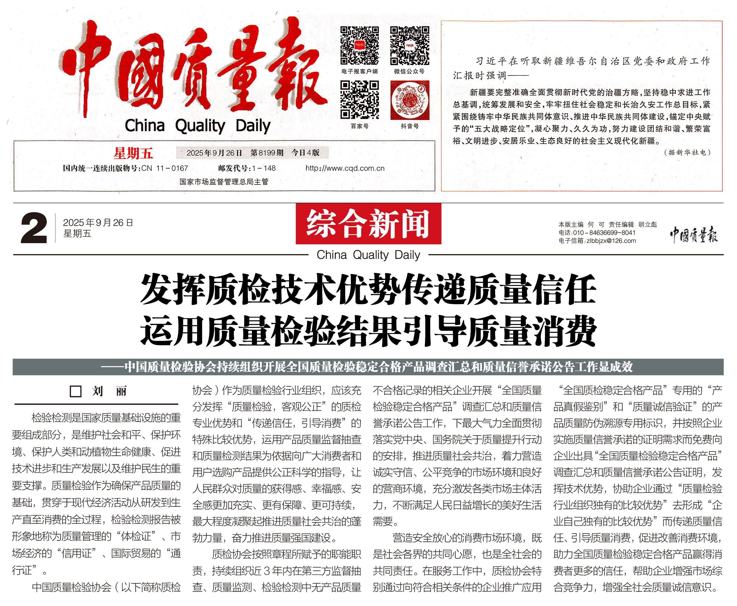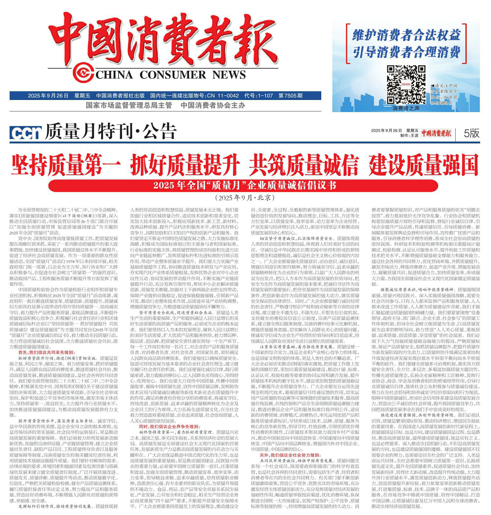 - 《中國(guó)質(zhì)量報(bào)》(2025年9月26日刊)發(fā)布:堅(jiān)持質(zhì)量第一 抓好質(zhì)量提升 共筑質(zhì)量誠(chéng)信 建設(shè)質(zhì)量強(qiáng)國(guó)——2025年全國(guó)“質(zhì)量月”企業(yè)質(zhì)量誠(chéng)信倡議書(shū)(2025年9月·北京)