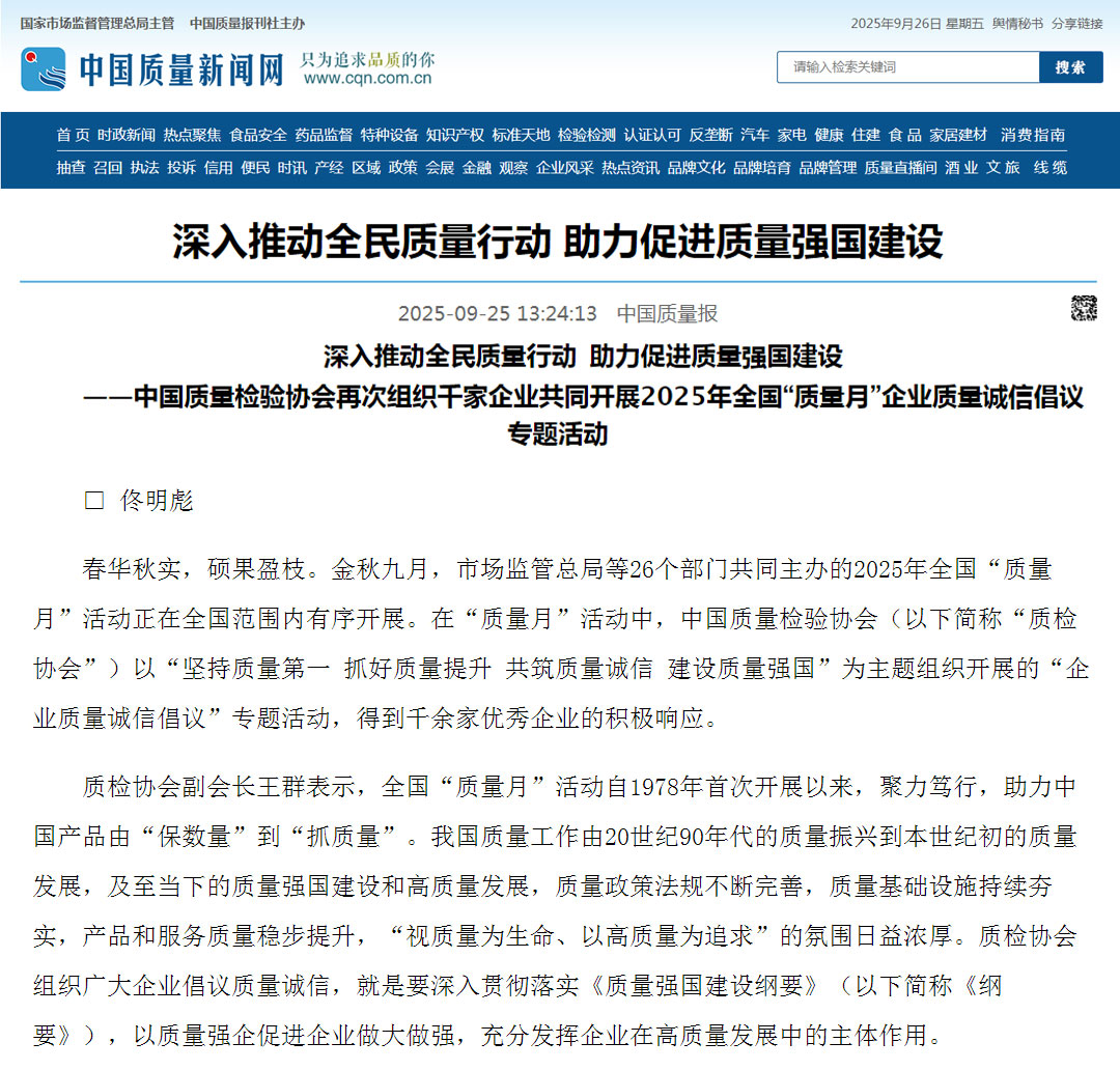 - 中金在線(xiàn)報(bào)道——千家企業(yè)發(fā)出倡議:視質(zhì)量為生命 以高質(zhì)量為追求——中國(guó)質(zhì)量檢驗(yàn)協(xié)會(huì)組織開(kāi)展2025年全國(guó)“質(zhì)量月”企業(yè)質(zhì)量誠(chéng)信倡議活動(dòng)