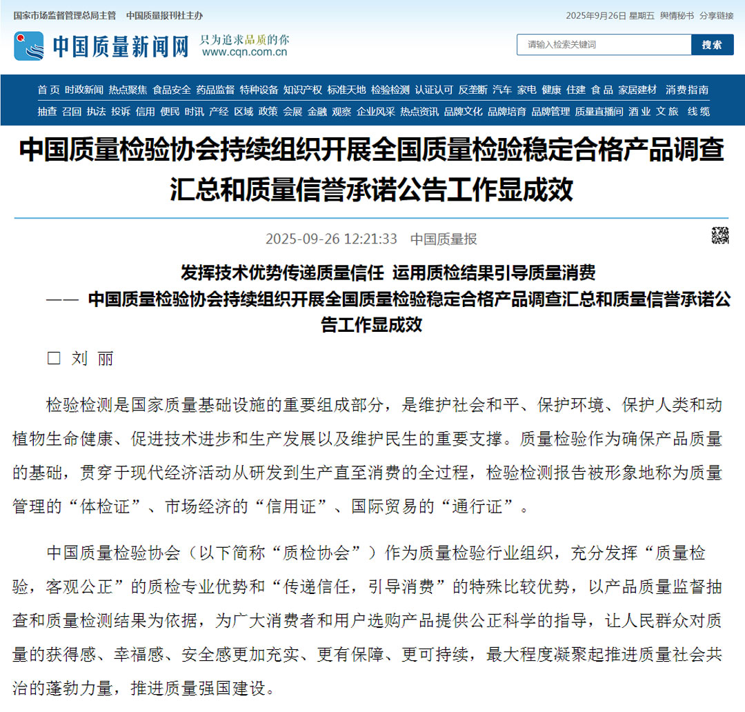 - 《中國(guó)質(zhì)量報(bào)》(2025年9月26日刊)發(fā)布:發(fā)揮技術(shù)優(yōu)勢(shì)傳遞質(zhì)量信任 運(yùn)用質(zhì)檢結(jié)果引導(dǎo)質(zhì)量消費(fèi)————中國(guó)質(zhì)量檢驗(yàn)協(xié)會(huì)持續(xù)組織開(kāi)展全國(guó)質(zhì)量檢驗(yàn)穩(wěn)定合格產(chǎn)品調(diào)查匯總和質(zhì)量信譽(yù)承諾公告工作顯成效